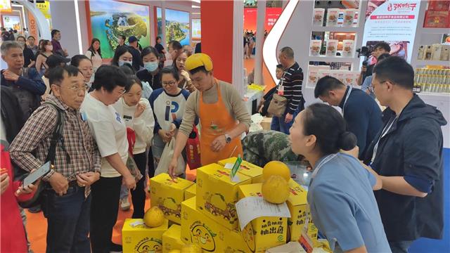 12月1日,深圳食博會上,市民游客在梁平展區購買梁平柚。
